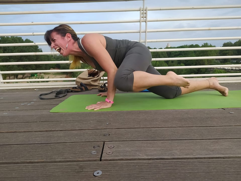Lo Yoga Anarchico è arrivato dopo. Quando finalmente il lockdown è terminato ma il distanziamento sociale prevedeva che si potesse fare attività fisica solo all’aperto, ho cominciato a tenere le mie lezioni sul Ponte della Musica, nel quartiere Flaminio, ovvero dove abito. Le lezioni hanno subito preso una piega piuttosto singolare, dove il divertimento e la fatica prevalevano decisamente sul silenzio e la spiritualità che pervadono le normali lezioni di yoga. Vero è che sono convinta che la spiritualità abbia molte forme e che sia rappresentata più verosimilmente da una risata che da un muso lungo, ma comunque è successo che le lezioni, così come concepite, avessero un discreto successo.